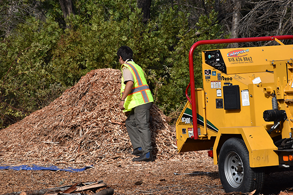 The mulch from the wood chipper was recycled and used to plant the new trees.